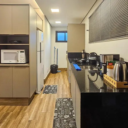 Flat Bonito Village, Localizacao Central, Piscina villa offers a fully-fitted kitchen featuring a refrigerator, a toaster, and kitchenware. - ❓